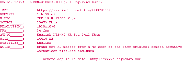 Voir le nfo de la release Uncle.Buck.1989.REMASTERED.1080p.BluRay.x264-GAZER
