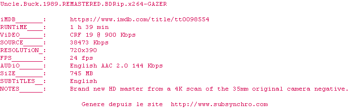 Voir le nfo de la release Uncle.Buck.1989.REMASTERED.BDRip.x264-GAZER