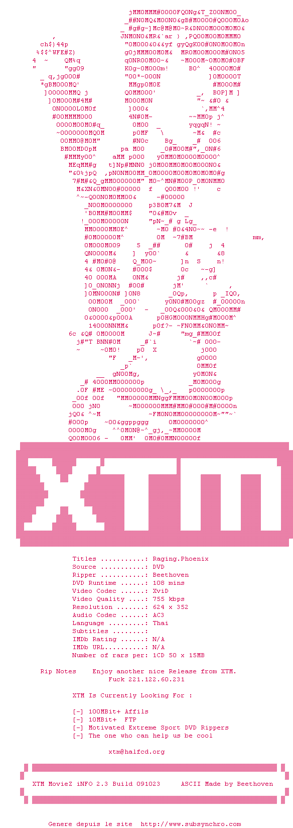 Voir le nfo de la release Raging.Phoenix.2009.DVDRip.XviD-XTM