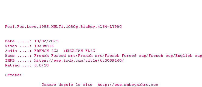Voir le nfo de la release Fool.For.Love.1985.MULTi.1080p.BluRay.x264-LYPSG