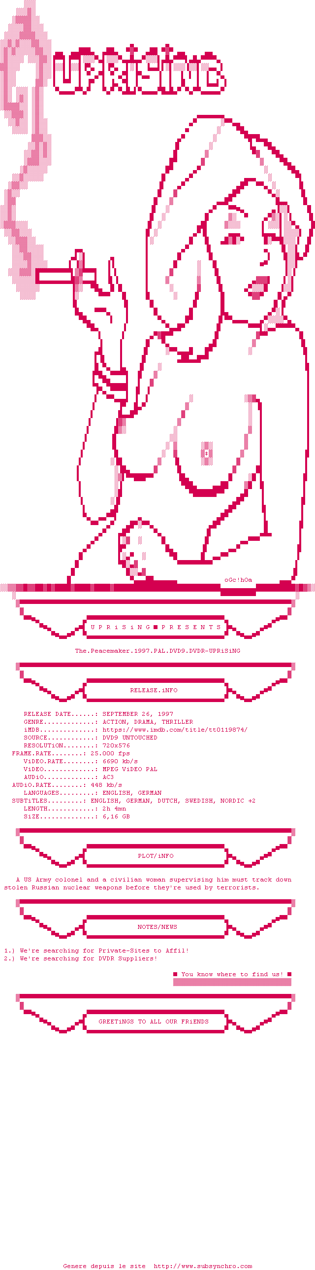 Voir le nfo de la release The.Peacemaker.1997.PAL.DVD9.DVDR-UPRiSiNG