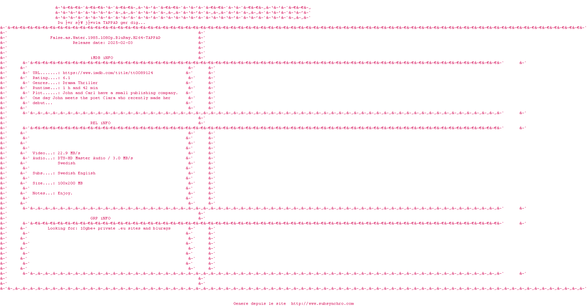 Voir le nfo de la release False.As.Water.1985.1080p.BluRay.H264-TAPPAD