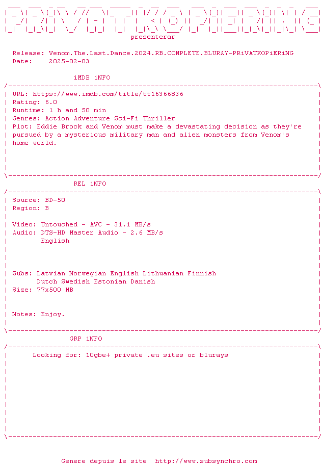 Voir le nfo de la release Venom.The.Last.Dance.2024.RB.COMPLETE.BLURAY-PRiVATKOPiERiNG