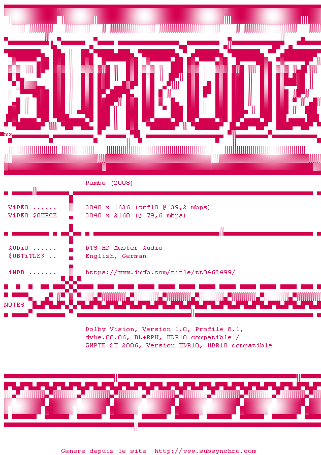 Voir le nfo de la release Rambo.2008.2160p.UHD.BluRay.H265-GAZPROM