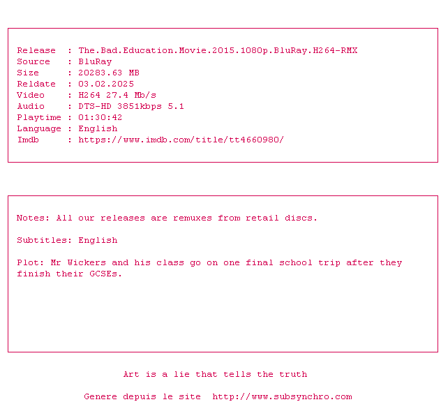Voir le nfo de la release The.Bad.Education.Movie.2015.1080p.BluRay.H264-RMX