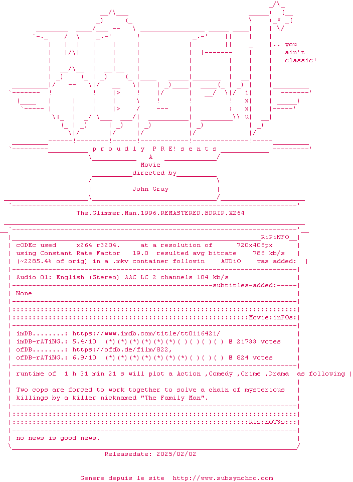 Voir le nfo de la release The.Glimmer.Man.1996.REMASTERED.BDRIP.x264-WATCHABLE