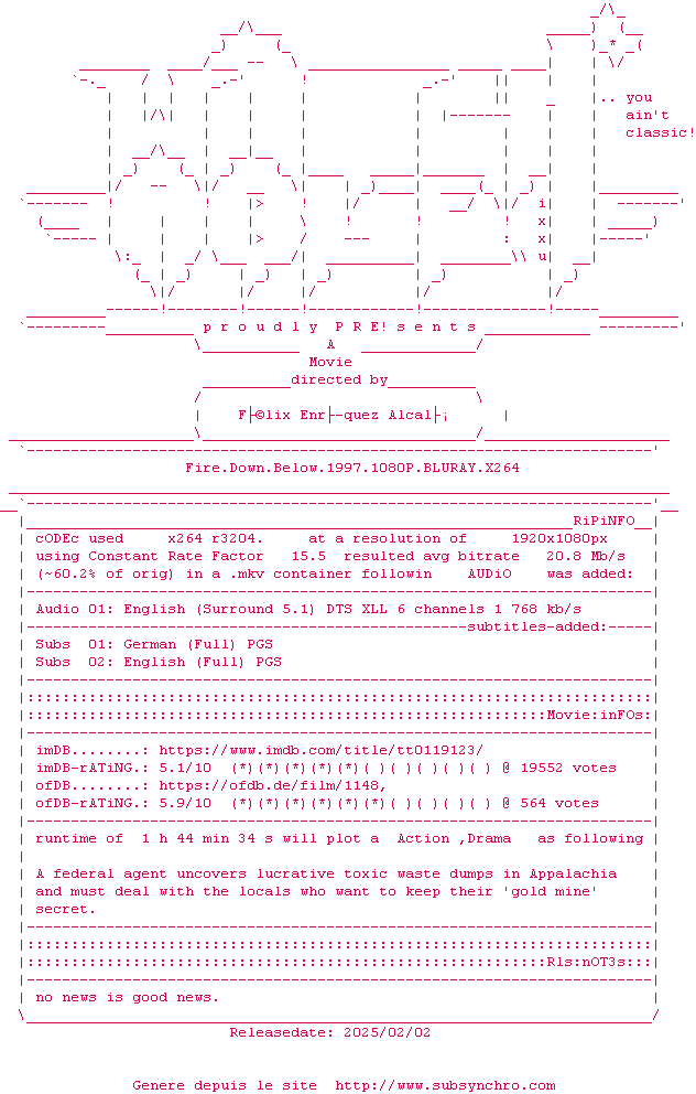 Voir le nfo de la release Fire.Down.Below.1997.REMASTERED.BDRIP.x264-WATCHABLE
