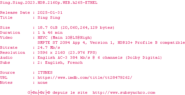 Voir le nfo de la release Sing.Sing.2023.HDR.2160p.WEB.H265-ETHEL