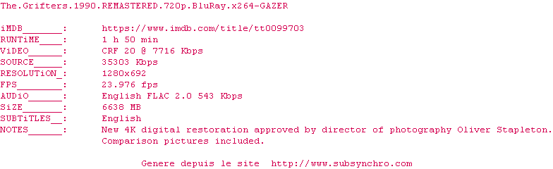 Voir le nfo de la release The.Grifters.1990.REMASTERED.BDRip.x264-GAZER