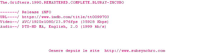 Voir le nfo de la release The.Grifters.1990.REMASTERED.COMPLETE.BLURAY-INCUBO