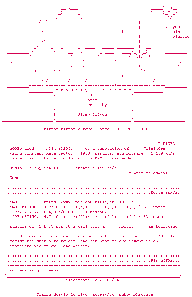 Voir le nfo de la release Mirror.Mirror.2.Raven.Dance.1994.DVDRIP.x264-WATCHABLE