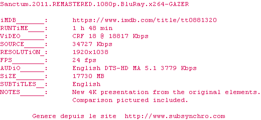 Voir le nfo de la release Sanctum.2011.REMASTERED.1080p.BluRay.x264-GAZER