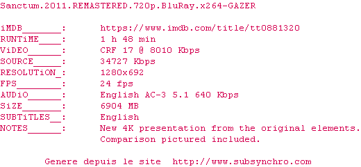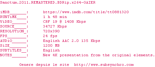 Voir le nfo de la release Sanctum.2011.REMASTERED.BDRip.x264-GAZER