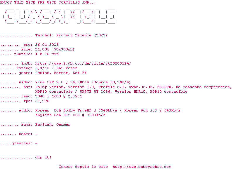 Voir le nfo de la release Talchul.Project.Silence.2023.2160p.UHD.BluRay.x265-GUACAMOLE