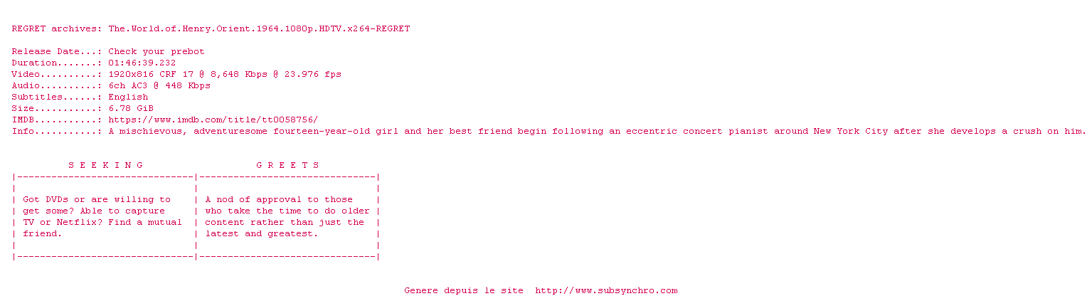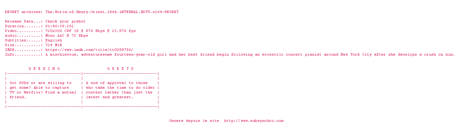 Voir le nfo de la release The.World.Of.Henry.Orient.1964.720p.HDTV.x264-REGRET