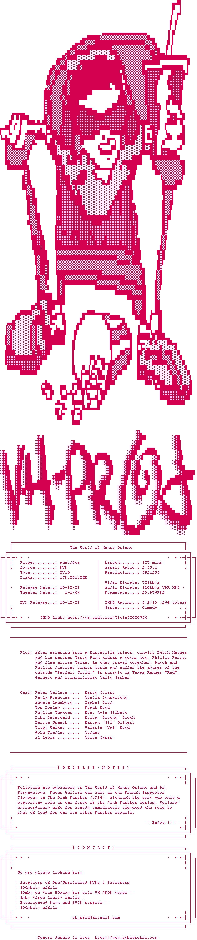 Voir le nfo de la release The.World.Of.Henry.Orient.1964.DVDRip.XViD-VH-PROD