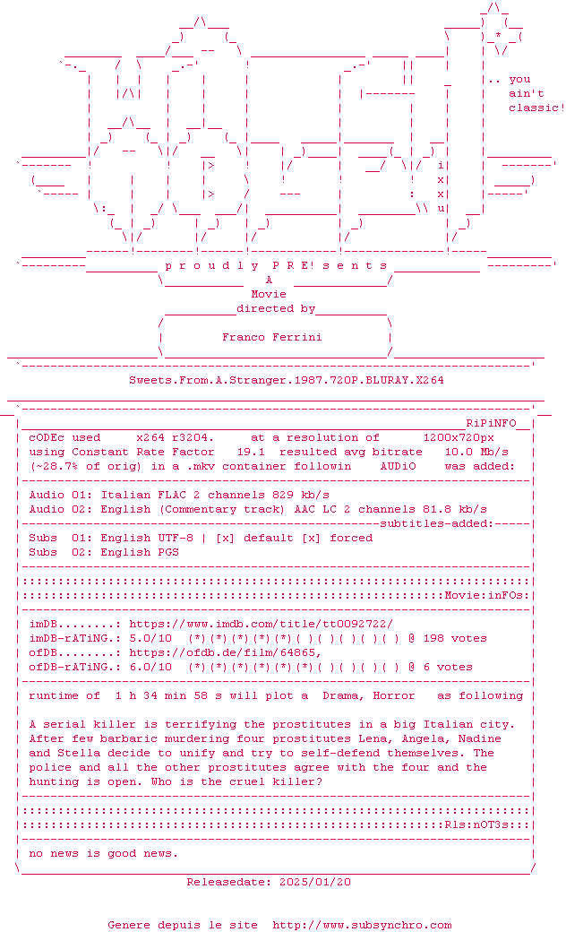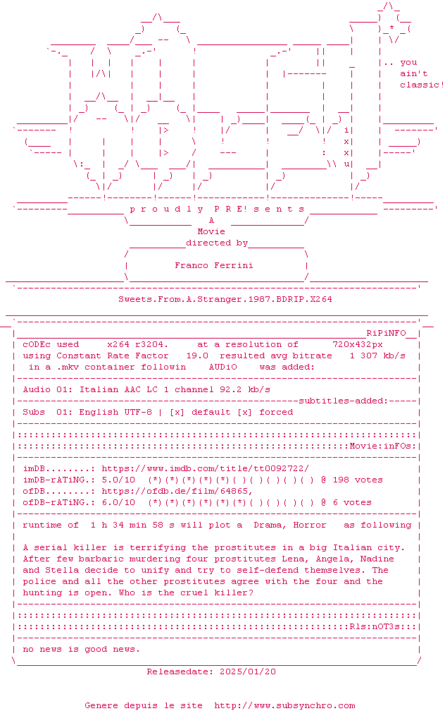 Voir le nfo de la release Sweets.From.A.Stranger.1987.1080P.BLURAY.H264-UNDERTAKERS