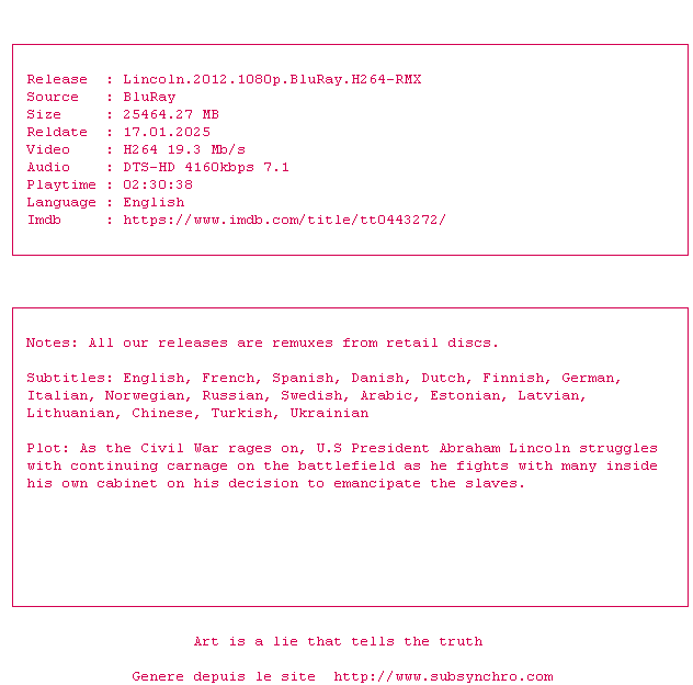 Voir le nfo de la release Lincoln.2012.1080p.BluRay.H264-RMX