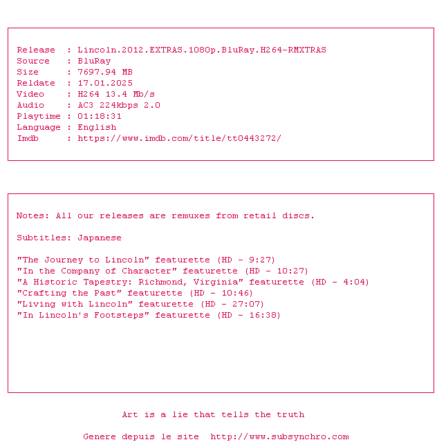 Voir le nfo de la release Lincoln.2012.EXTRAS.1080p.BluRay.H264-RMXTRAS
