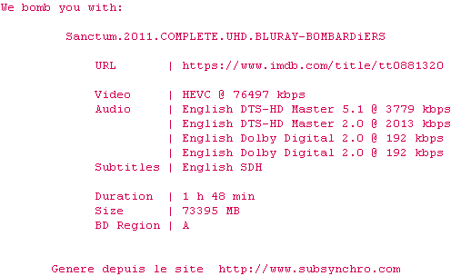 Voir le nfo de la release Sanctum.2011.2160p.UHD.BluRay.H265-MALUS