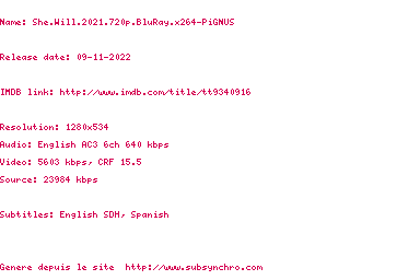 Voir le nfo de la release She.Will.2021.720p.BluRay.x264-PiGNUS