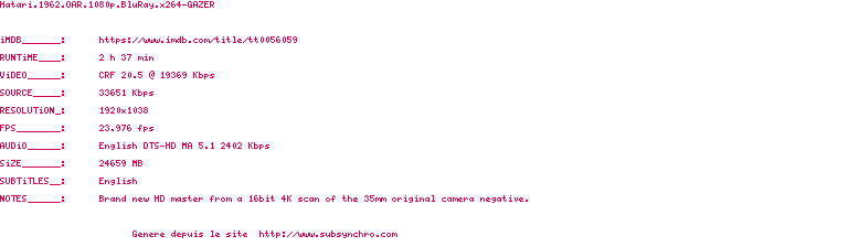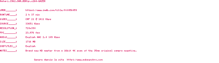 Voir le nfo de la release Hatari.1962.OAR.BDRip.x264-GAZER