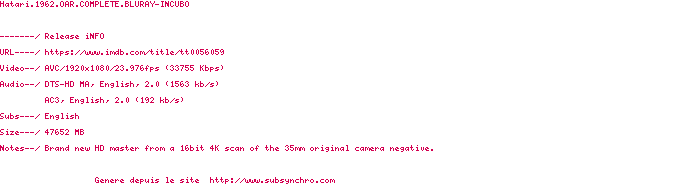 Voir le nfo de la release Hatari.1962.OAR.1080p.BluRay.x264-GAZER