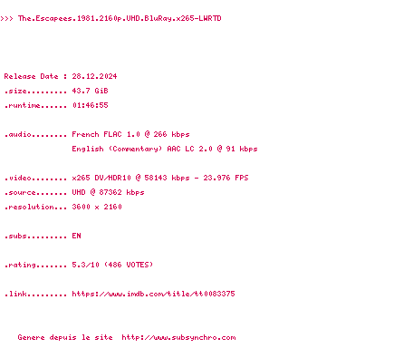Voir le nfo de la release Snake.Eyes.1998.2160p.UHD.BluRay.x265-B0MBARDiERS