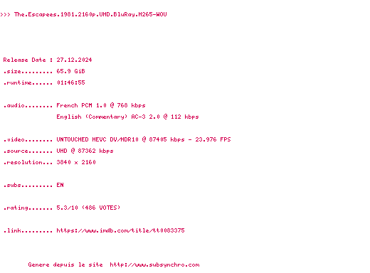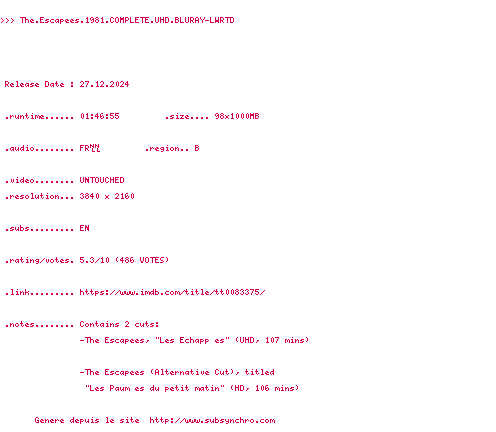 Voir le nfo de la release The.Crimson.Rivers.2000.2160p.UHD.BluRay.x265-SURCODE