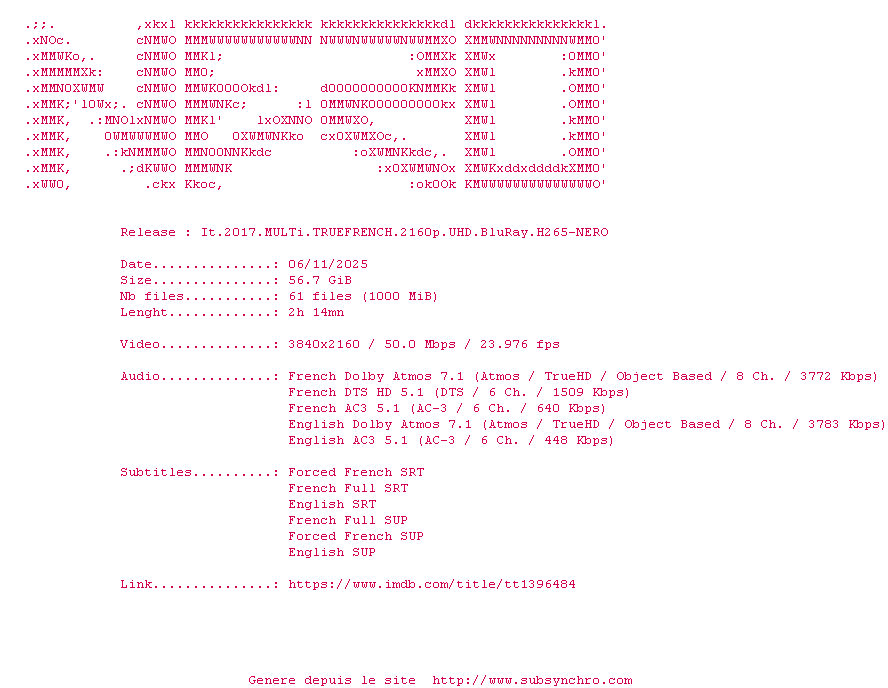 La release It.2017.MULTi.TRUEFRENCH.2160p.UHD.BluRay.H265-NERO est en 4K