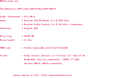 Voir le nfo de la release The.Addiction.1995.2160p.UHD.BluRay.H265-MALUS