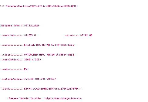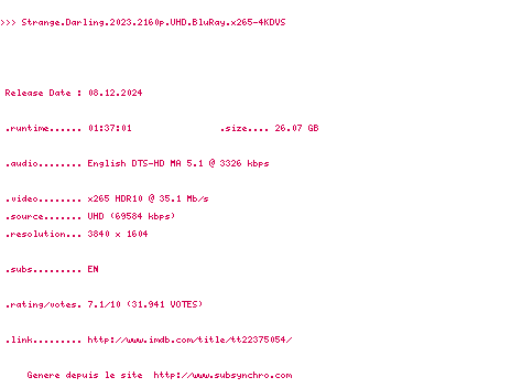 Voir le nfo de la release Strange.Darling.2023.2160p.UHD.BluRay.x265-4KDVS