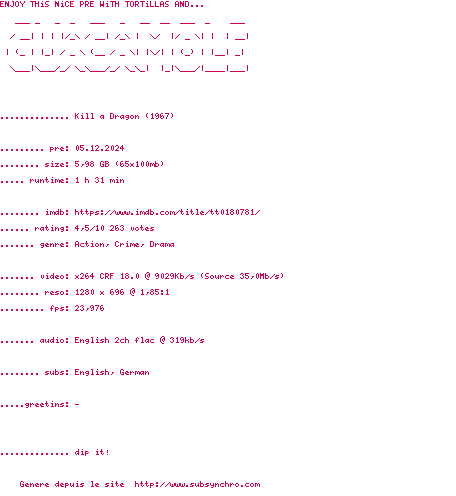 Voir le nfo de la release Kill.A.Dragon.1967.720p.BluRay.x264-GUACAMOLE