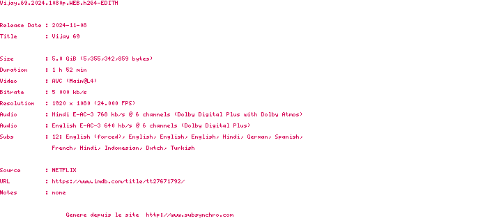Voir le nfo de la release Vijay.69.2024.1080p.WEB.H264-EDITH