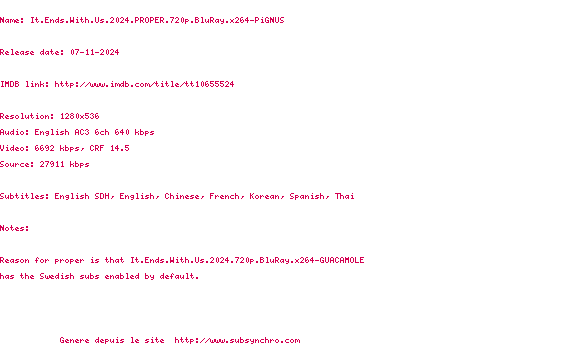 Voir le nfo de la release It.Ends.With.Us.2024.PROPER.720p.BluRay.x264-PiGNUS
