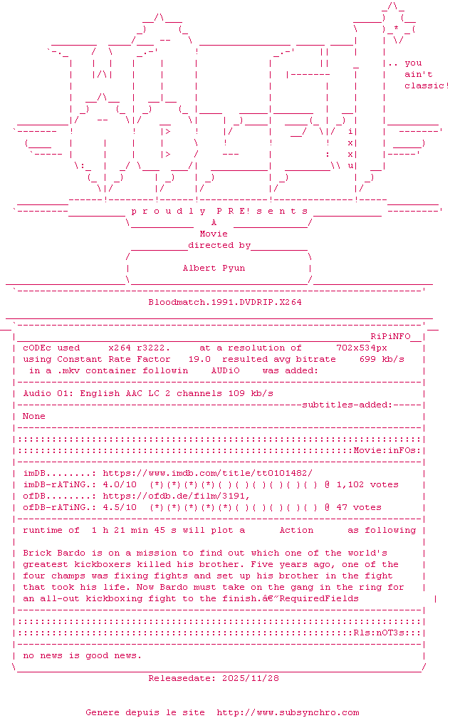 Voir le nfo de la release Bloodmatch.1991.DVDRIP.x264-WATCHABLE