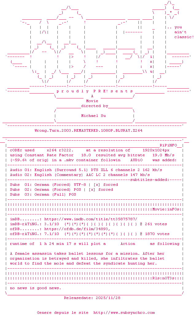 Voir le nfo de la release Wrong.Turn.2003.REMASTERED.1080P.BLURAY.x264-WATCHABLE