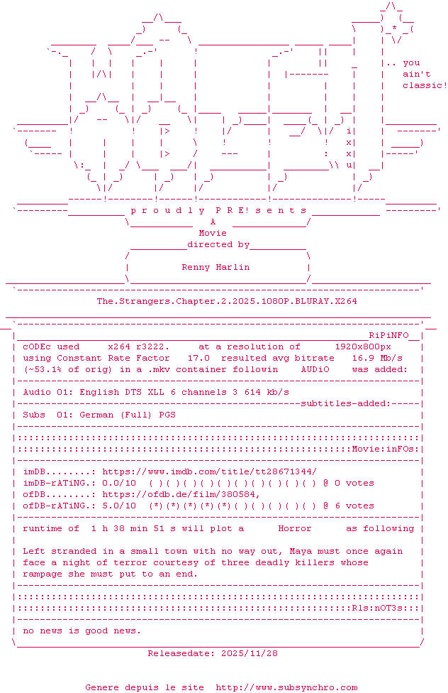 Voir le nfo de la release The.Strangers.Chapter.2.2025.MULTI.COMPLETE.BLURAY-FULLBRUTALiTY