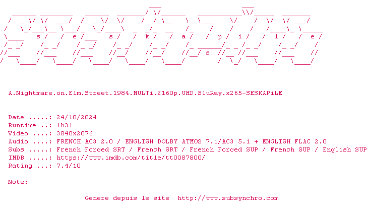 Voir le nfo de la release A.Nightmare.On.Elm.Street.1984.MULTi.2160p.UHD.BluRay.x265-SESKAPiLE
