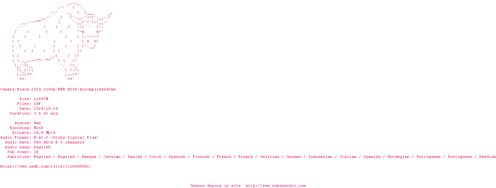 Voir le nfo de la release Canary.Black.2024.HDR.2160p.WEB.H265-AccomplishedYak