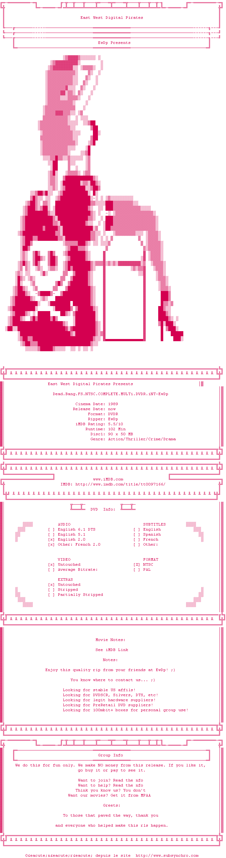 Voir le nfo de la release Dead.Bang.1989.FS.NTSC.COMPLETE.MULTi.DVDR.INT-EwDP