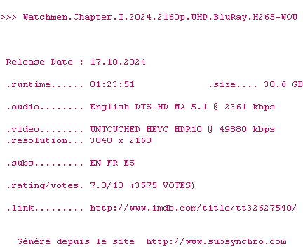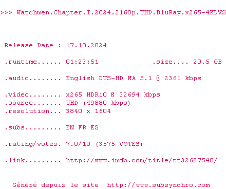 Voir le nfo de la release Watchmen.Chapter.I.2024.2160p.UHD.BluRay.x265-4KDVS