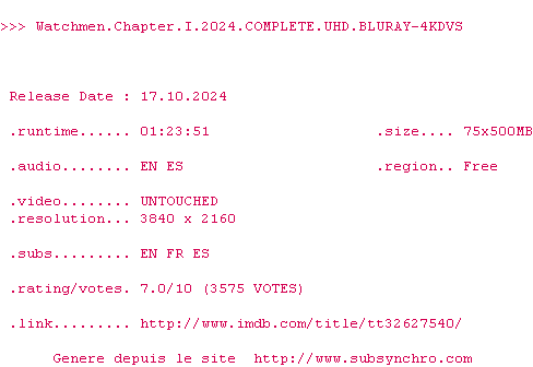 Voir le nfo de la release Watchmen.Chapter.I.2024.COMPLETE.UHD.BLURAY-4KDVS