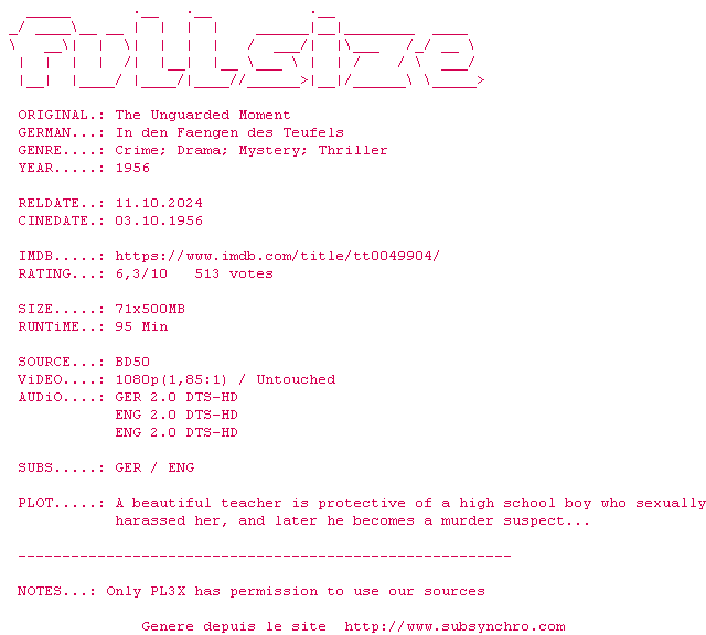 Voir le nfo de la release The.Unguarded.Moment.1956.DUAL.COMPLETE.BLURAY-FULLSiZE