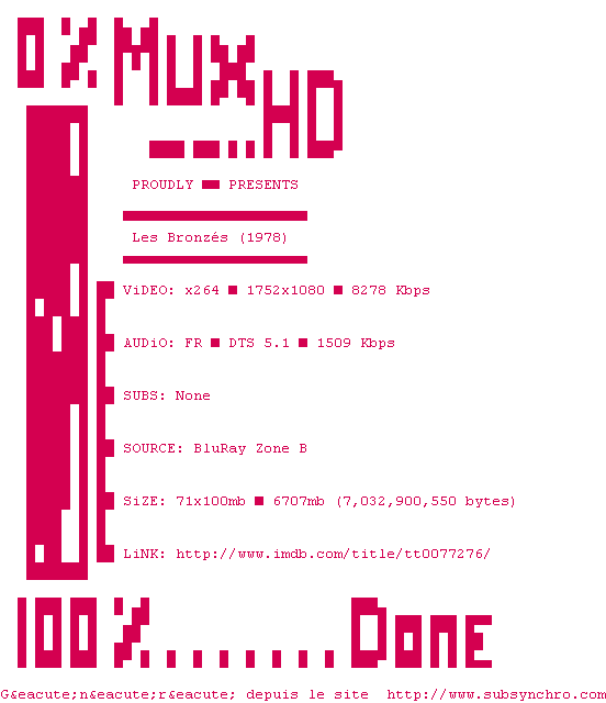 Voir le nfo de la release Les.Bronzes.1978.FRENCH.1080p.BluRay.x264-MUxHD