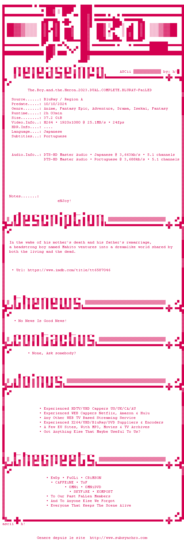 Voir le nfo de la release The.Boy.And.The.Heron.2023.DUAL.COMPLETE.BLURAY-FaiLED