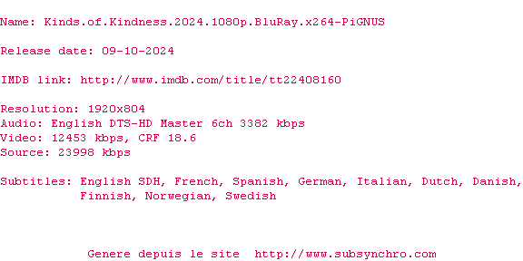Voir le nfo de la release Kinds.Of.Kindness.2024.1080p.BluRay.x264-PiGNUS