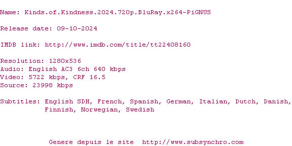 Voir le nfo de la release Kinds.Of.Kindness.2024.720p.BluRay.x264-PiGNUS