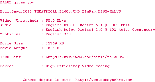 Voir le nfo de la release Evil.Dead.2013.2160p.UHD.BluRay.H265-MALUS