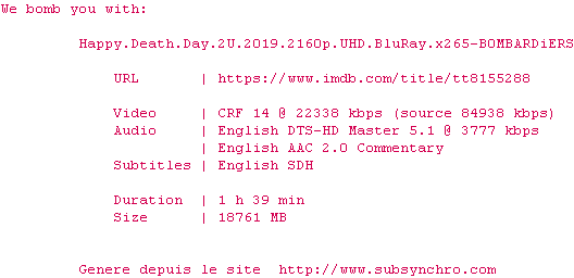 Voir le nfo de la release Happy.Death.Day.2U.2019.2160p.UHD.BluRay.x265-B0MBARDiERS